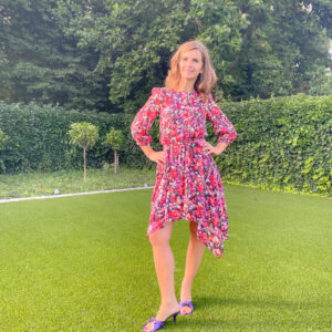 Midi lengte,V-uitsnijding op de rug, korte mouwen en een geknoopt stuk vooraan.